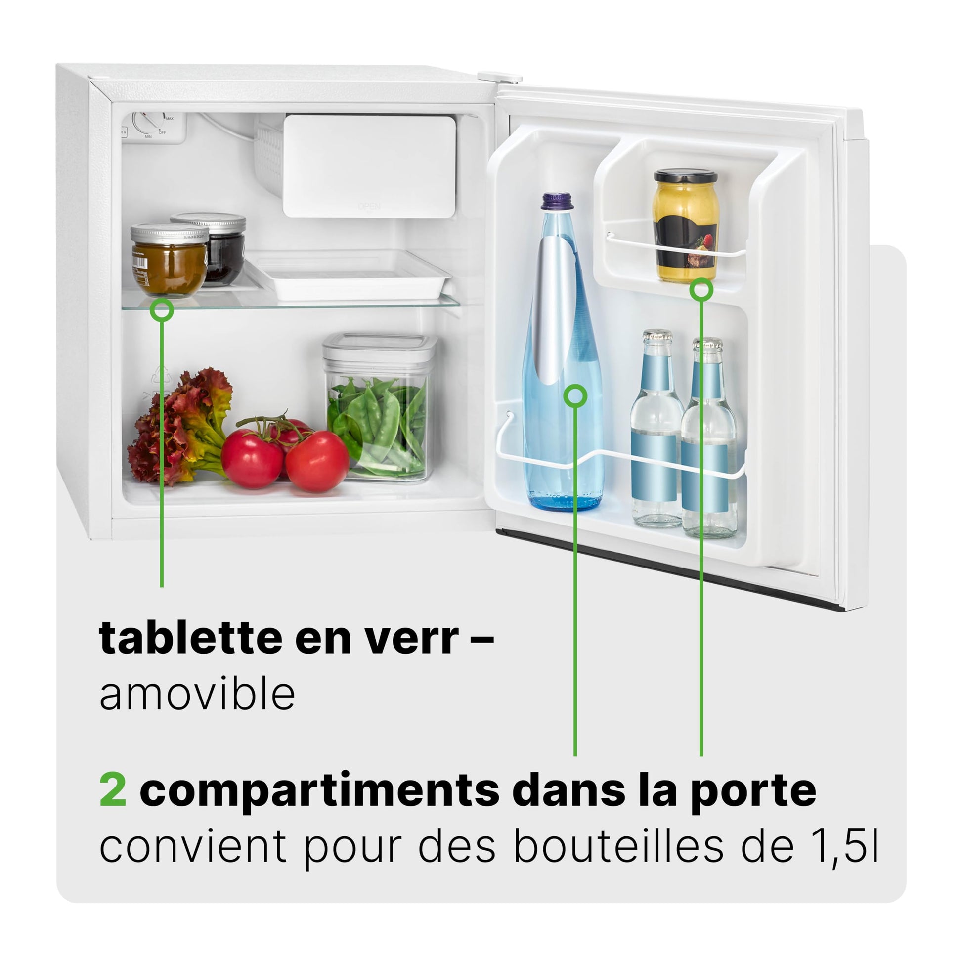 - GRAN CAPACIDAD INTERIOR: A pesar de su reducido tamaño, el mini bar tiene una capacidad neta del frigorífico de 45 litros. Dispone de 1 estante en el interior del refrigerador y 2 estantes en la puerta para mantener tus alimentos y bebidas organizados.