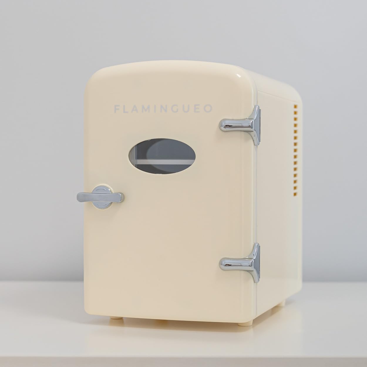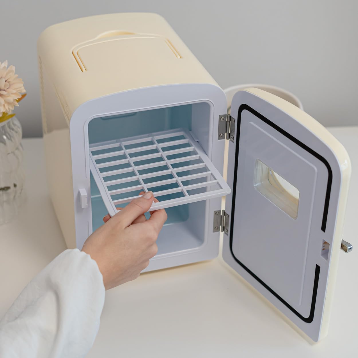 - DISEÑO: La mini nevera tiene un diseño retro y compacto. Es portátil y fácil de llevar gracias al asa superior. También dispone de una balda removible y una mini ventana en la puerta que permite ver lo que hay en el interior.